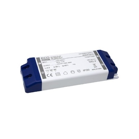 Alimentatore in plastica, SLIM di dimensioni ridotte, ideale per installazioni ad incasso ed utilizzo interno. Tensione costante in tecnologia Switching, ideale per fornire energia ai dispositivi a LED (strisce, barre, moduli a LED) e ad altri dispositivi analoghi.Tensione d'ingresso 220-240 Vac Tensione d'uscita 24 Vdc Corrente d'uscita 1.66 A Potenza 40 W Ripple 240 mVp-p Tecnologia Switching Connessione d'ingresso Morsetti a vite Connessione d'uscita Morsetti a vite Grado di protezione IP20 Classe isolamento II Protezione Corto circuito, Sovracorrente, Sovratensione Funzioni aggiuntive Autorestart Temperatura di lavoro -10°C ~ 40°C Materiale Plastica Colore Bianco Dimensioni 160x20x58 mm Peso 150 g Confezione Scatola