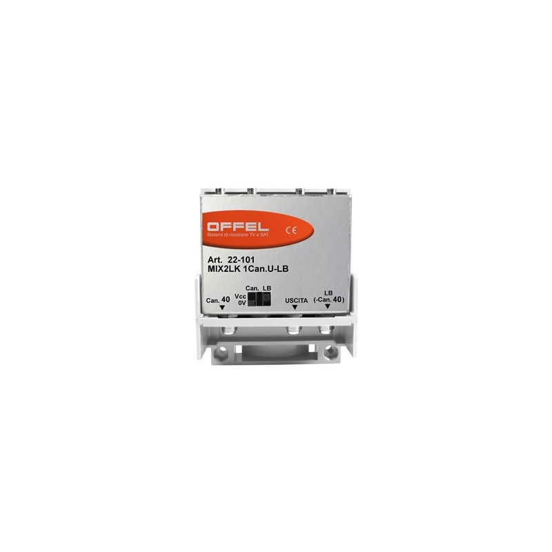 Caratteristiche art. 22-101 MIX2LK 1Can.U-LB Esempio di applicazione all'ingresso UHF o di banda 5 del centralino Ha un ingresso filtrato di canale ed una trappola corrispondente sull'ingresso largabanda per bloccare il disturbo. Miscelatore TV per esterno, ideale per miscelare un canale proveniente da una direzione con i segnali ricevuti da un'altra direzione e giungere al TV con un’unica discesa. IN Can. 25 22-101 MIX2LK 1Can.U-LB OUTIN LB Articolo22-101 SiglaMIX2LK 1Can.U-LB N. ingressi2 Attenuazione di passaggio can. UHFdB ±1≤ 5 Attenuazione di passaggio banda VHF+UHFdB ±1< 4 Larghezza canaleMHz ±19 Selettività canaledB> 16 Dimensioni (LxWxH)mm87x48x105 Dimensioni imballo (LxWxH)mm110x60x115 Peso imballoKg0,3 Temperatura di funzionamento°C-10 ÷ +55 Conforme alle normeEN 55083-2, EN 60065 I dati tecnici sono riferiti alla temperatura di 25 °C In fase d'ordine occorre specificare il canale UHF desiderato. • Filtro di canale a due cavità risonanti • Trappola corrispondente sull'ingresso largabanda • Contenitore schermato con connettori a vite tipo F