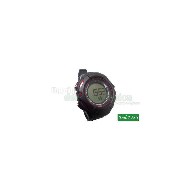 Orologio sportivo da polso con cardiofrequenzimetro e fascia elastica pettorale di rilevazione del battito cardiaco. Dotazione completa di funzionalità per lo sportivo di tutti i generi: orologio con ora, minuti, secondi, e data con anno, mese e giorno; formato 12/24 ore, rintocco orario e calendario perpetuo; funzioni sveglia e "snooze"; cardiofrequenzimetro con calcolo del consumo calorico; timer e cronometro; memoria delle prestazioni con diverse funzionalità per gli esercizi dell'atleta; calcolo del BMI (Body Mass Index - Indice di Massa Corporea); retroilluminazione; orologio impermeabile fino a 30m di profondità, fascia pettorale con sensore resistente all'acqua (N.B.: NON impermeabile). L'allenamento atletico, sia fine a se stesso, sia preparatorio per altri sport, richiede ormai un approccio scientifico, a tutti i livelli, dal semplice ciclo di esercizi a fine di dimagrimento/mantenimento fino all'attività professionistica. Questo cardiofrequenzimetro, dal design compatto e moderno, permette all'atleta di tenere sotto controllo in tempo reale tutti i parametri necessari per ottenere dal proprio allenamento i risultati prefissati, e offre inoltre le funzioanlità complete di un orologio con cronometro e timer.