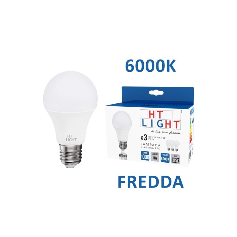 LAMPADA CLASSICA LED 230VOLT 11WATT E27 6000K CONFEZIONE 3 PEZZI