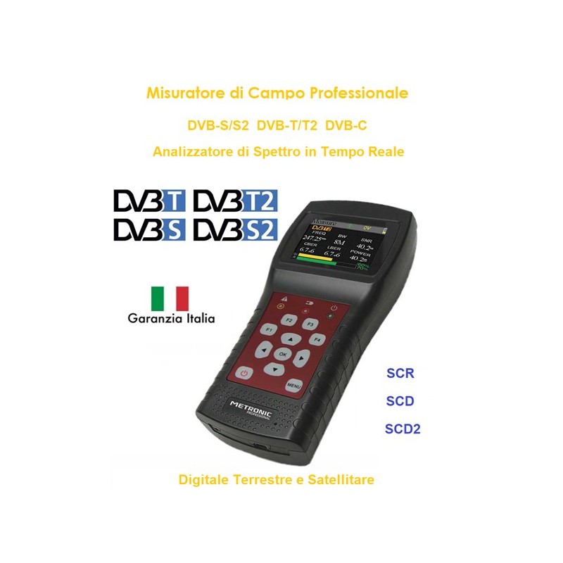 Strumento professionale con analizzatore di spettro in tempo reale,per analisi di segnale gigitali SAT,DTT E TV via cavo.Dotato di funzione SCR fino a 8 utenze,funzione dCSS fino a 32 utenze,funzione di puntamento e comando di una parabola motorizzata.