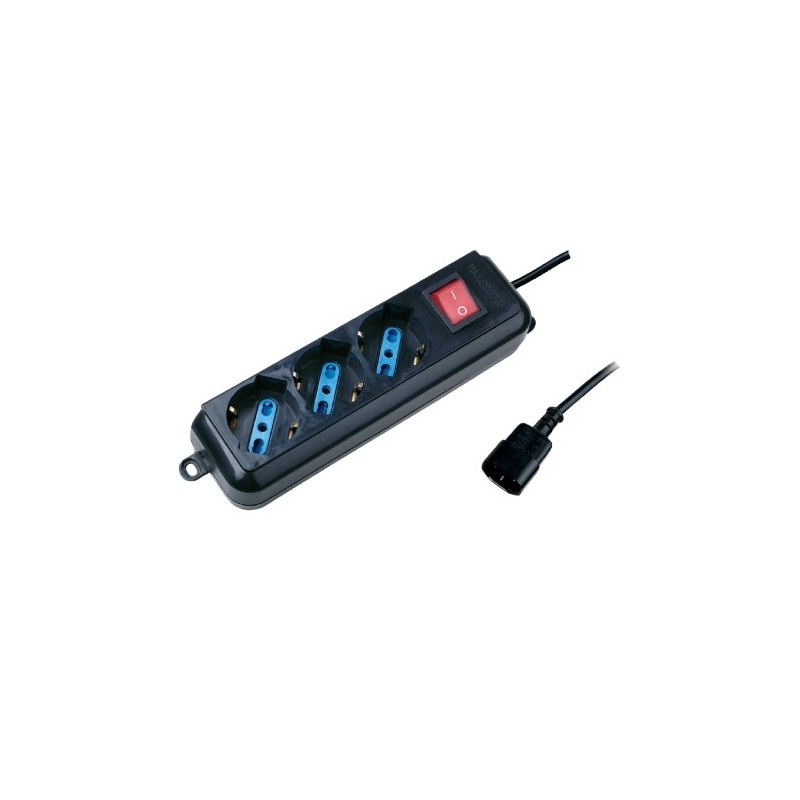 Multipresa tripasso 10/16A/SCHUKO • 3 posizioni • Dotata di terra ed elevato grado di protezione • Interruttore generale luminoso • Carico max 2.500W - Nera. Cavo con spina IEC per l'uso con UPS.